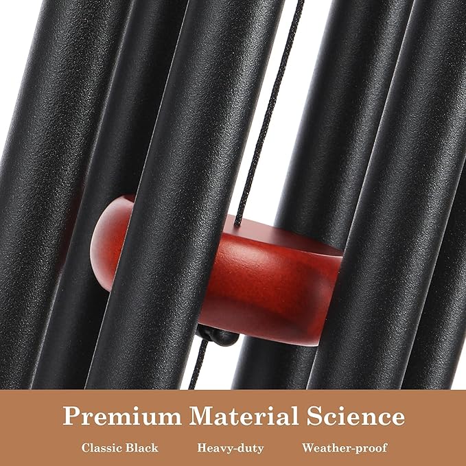 • 【Classic Black Wind Chimes】The wind chime is made of aluminum pipe and pine. The total length of the wind chime from the top's S-shaped hook to the bottom's catcher is 37" among them, six classic black anodized aluminum tubes have excellent corrosion resistance and wear resistance, and the length ranges from 9" to 13". The wood is made of wear-resistant and non-cracking pine. The adjustable wooden striker allows you to adjust your favorite position at will.