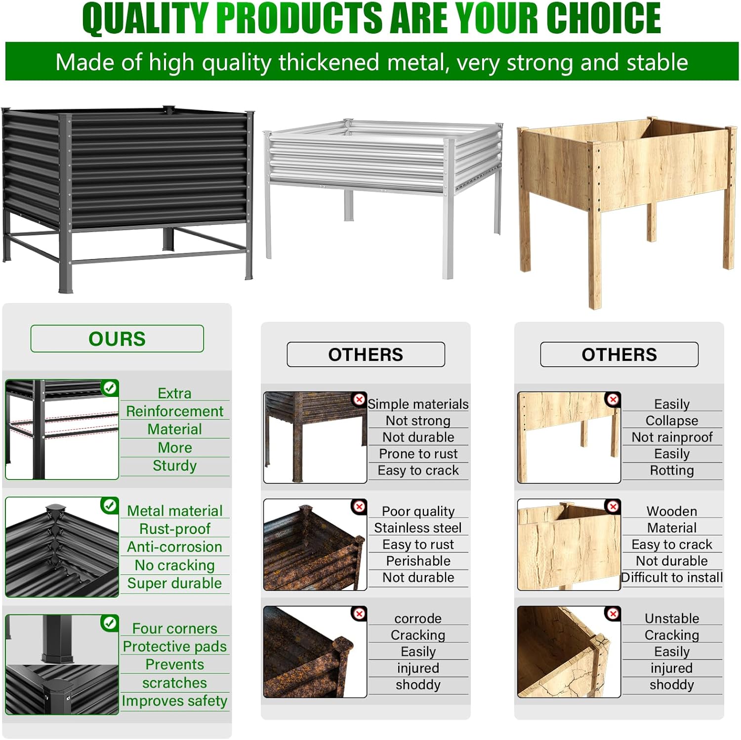 • 【Distinctive Design】-Outdoor elevated garden beds, our custom design style features galvanized sheet metal on the top, a stainless steel frame on the middle base, and the lower four corners are made of heavy-duty steel with a black powder-coated finish,This combination exceeds the lifespan of wooden products and ensures excellent rust resistance to keep the garden bed in the best condition for a long time.