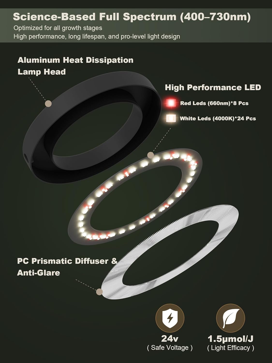 • 【Durable Build & 2-Year Warranty】: Engineered for longevity with a heat-dissipating aluminum alloy lamp head, a durable aluminum alloy telescopic pole (extending 7 inches), and a tough PC Prismatic Diffuser(60° wide-angle light), ensuring an impressive 50,000-hour lifespan. Plus, enjoy peace of mind with our 2-year warranty on these plants grow lights. Choose GLOWRIUM for reliable, long-lasting support for your indoor oasis!