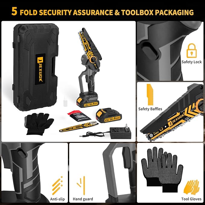 - Multiple safety protections - Your safety is our top priority. The JEXUGK upgraded small chainsaw is equipped with a safety lock to prevent accidental startup. The protective deflector plate prevents debris from flying around. Cut-resistant gloves protect your hands. The anti-slip textured handle allows you to hold it tighter and is less likely to fall off. JEXUGK always puts your safety first