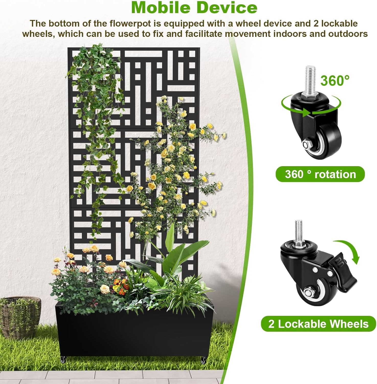 • Mobile Wheels: The bottom of the planter box has 4 wheels and 2 locking wheels, which can be used to fix and facilitate movement indoors and outdoors