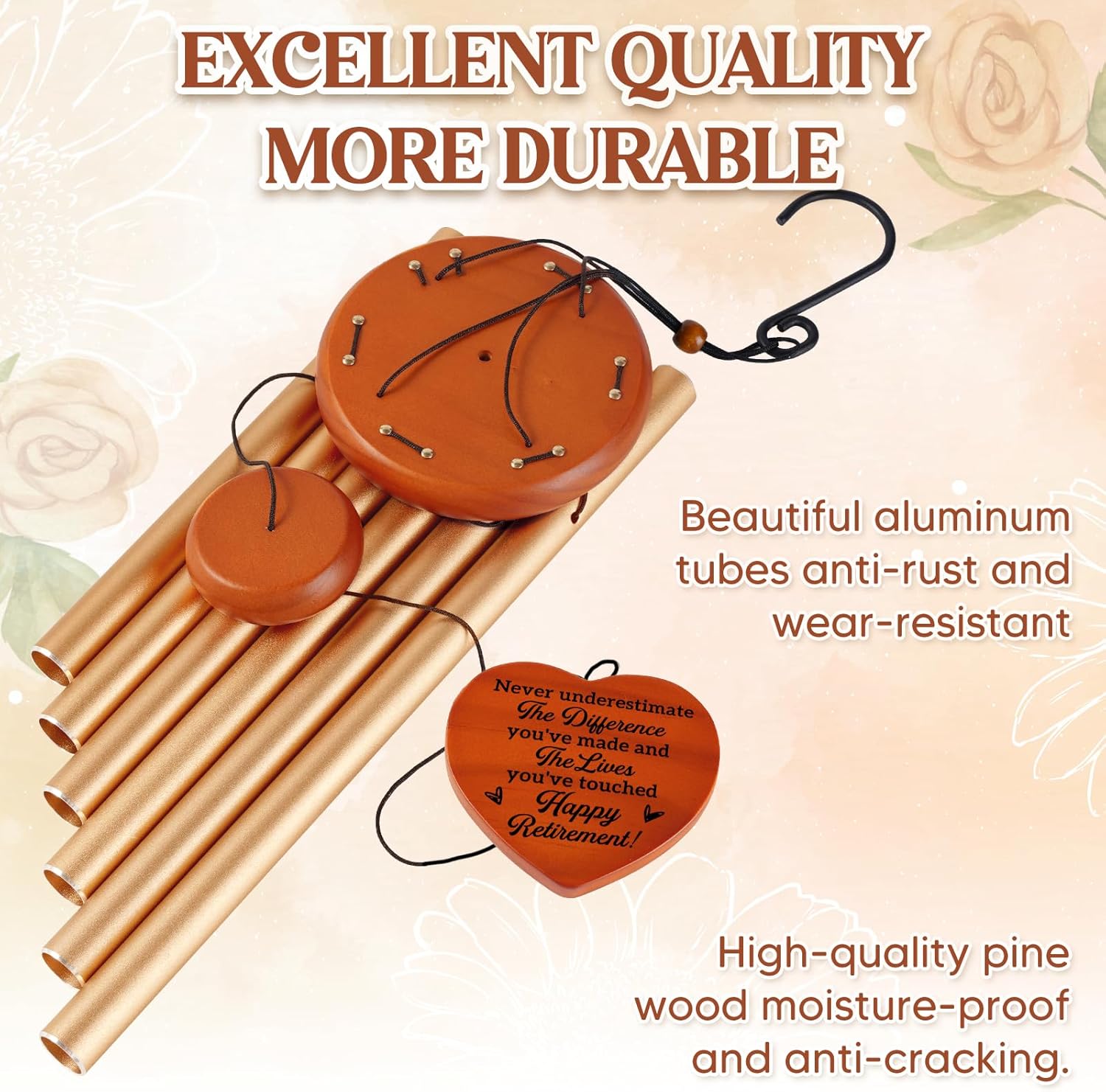 • [36" High Quality Retirement Wind Chime] - Carefully selecting tens of thousands of types of wood, testing the sound of hitting aluminum tubes, and ultimately choosing top-quality pine wood for production. which is lasting, waterproof and wear-resistant. The attached 6 anodized aluminum tubes are corrosion-resistant and thickened. Stand the test of time and all weather conditions. Come rain or shine, your gift from the heart will continue to cheer and inspire them for years to come. Exquisite packaging boxes are sure to impress people.