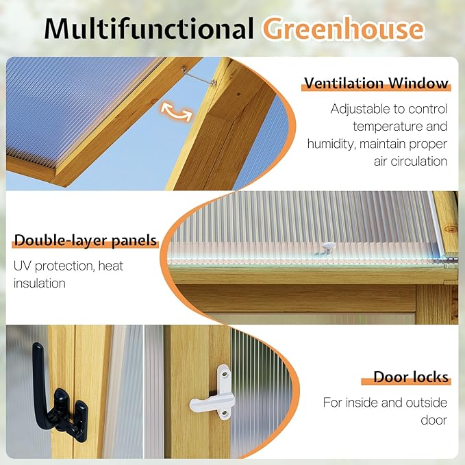 • Sturdy Wood Frame: Wood greenhouse built with premium cedar and reinforced metal hardware for durability. Wind rating reaches 38-46mph and the maximum load capacity is 625lbs, which ensure stability in various weather conditions