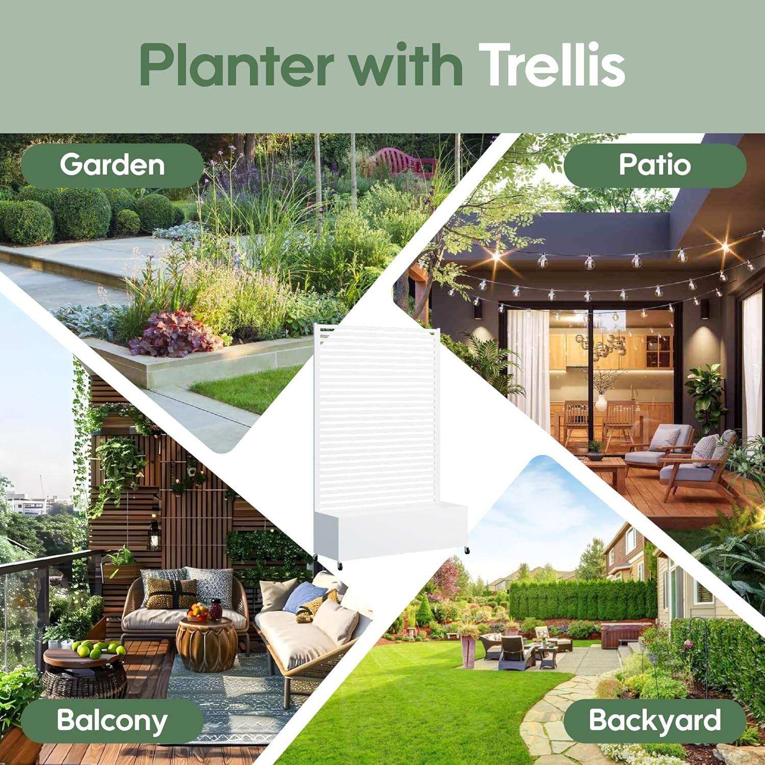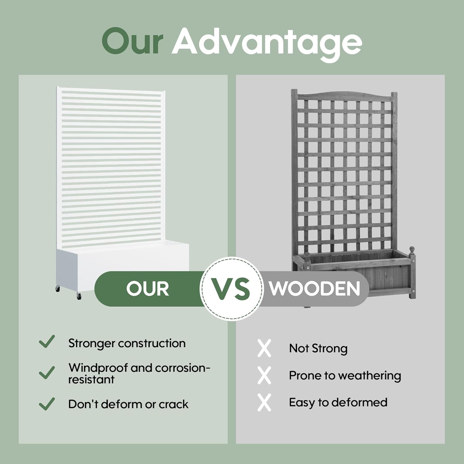 Metal Planter Box with Trellis Privacy Screen, Raised Garden Bed with Trellis & Wheels, Privacy Planters for Patio, Planter Box with Drainage Holes for Climbing Plants, Flower, 73"x 47"x 16", White