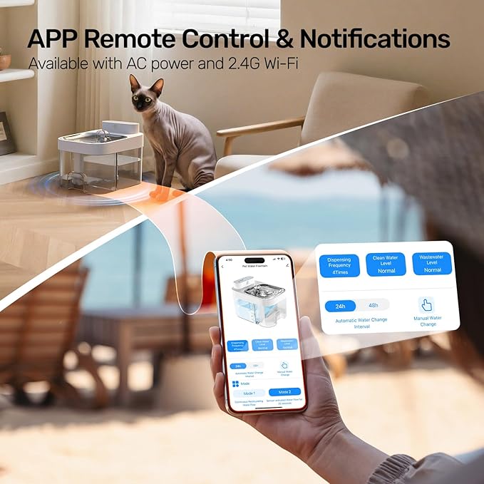 - [App Monitoring & Notifications] - This smart cat fountain lets you monitor both water levels remotely through the app. You can customize drainage schedules, trigger manual water refresh, and set up personalized scenarios. Receive instant notifications so you’re always informed about your pet’s water supply—anytime, anywhere. Note: App functions require the fountain to be plugged in and are not available in battery mode.