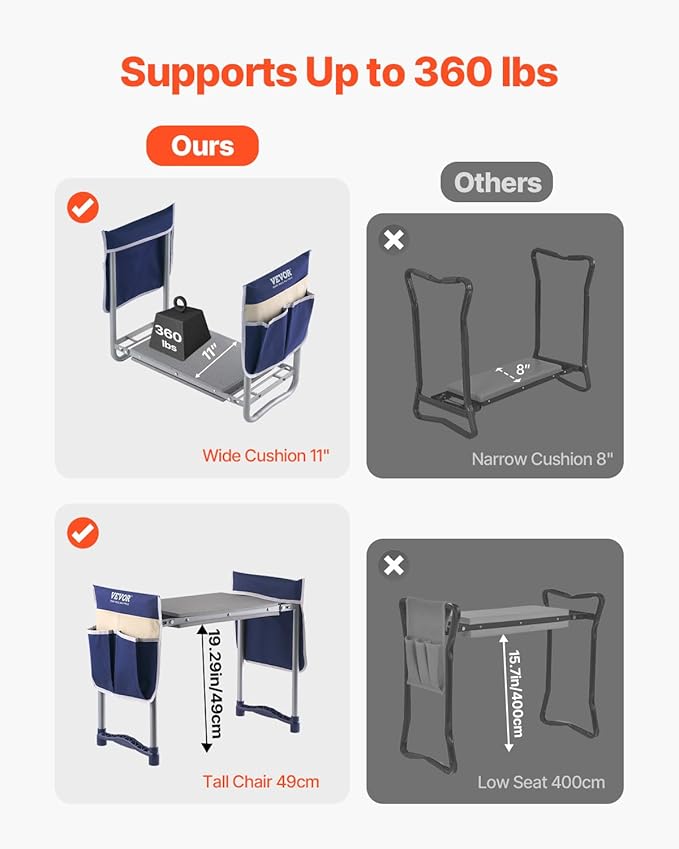• Supports Up to 360 lbs: Built with high-strength A3 steel and a powder-coated finish, this garden kneeling stool ensures stability and durability. It supports up to 330 lbs, making it ideal for gardening, household chores, and any activity requiring strong support.