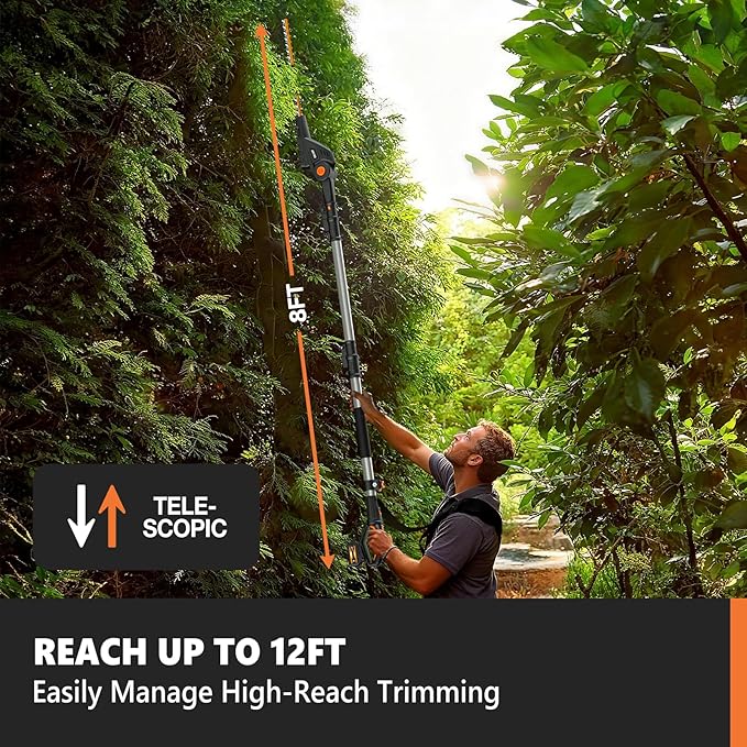 - 【 8.6-inch Pole Saw Steel Blade】Equipped with an 8.6-inch steel blade and a chain speed of 18 feet per second, this tree pole saw effortlessly slices through 4x4 thickness Tree branches up to 110 times with 2 batteries, ensuring efficient and precise cuts every time.