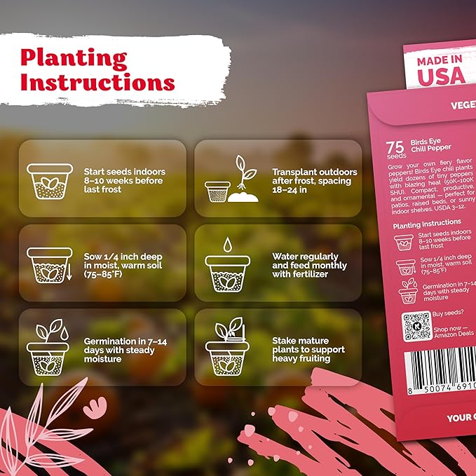 • Fiery Germination Power: Birds eye chili seeds sprout in 7-14 days at 75-85°F with up to 95% success. Vegetable Garden seeds for USDA 3-12 indoor/outdoor beds with 12–18 inches height & spread plants.
