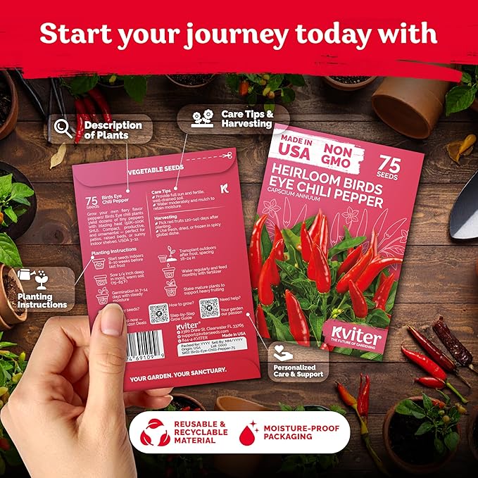 KVITER 75 Birds Eye Chili Pepper Seeds for Planting (Capsicum Annuum) — Thai Chili Red Pepper, Extra‑Hot 50K-100K SHU, High‑Yield Bush — Heirloom & Organic Vegetable Seeds for Outdoor & Indoor Garden