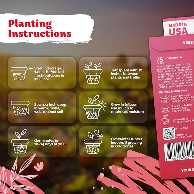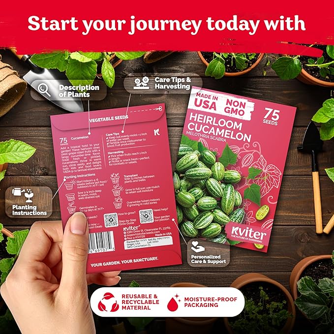 • High Germination Rate: cucamelons seeds sprout in 10-14 days at 70 °F, Full sun, Start inside 4 weeks before last frost or outdoors in warm soil. Sow 1/4" deep, space 9-12" apart – perfect climbing cucumber seeds for patio or vegetable garden.