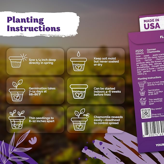• High Germination Rate: Chamomile seeds sprout in 7‑14 days at 68‑86°F when sown 1/4 in deep and misted; enjoy up to 95 % success in USDA 3‑9 for chamomile flowers in herb gardens or containers.