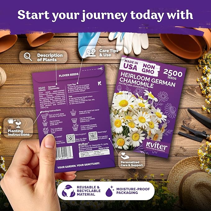 KVITER 2,500 German Chamomile Seeds for Planting (Matricaria Chamomilla/Recutita) – Heirloom & Non-Gmo Medicinal Herb Seeds, Flowers for Remedies & Chamomile Tea Organic – Indoors/Outdoors Herb Garden