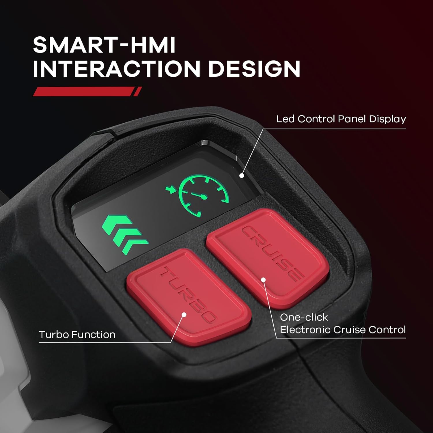 - [EZ HMI LED CONTROL PANEL] Enhulk cordless leaf blower has a built-in integrated EZ HMI LED control panel that can display the current working mode. CRUISE CONTROL and TURBO mode are indicated in green, low battery is indicated in red, and malfunction is indicated in flashing red for best interactive experience