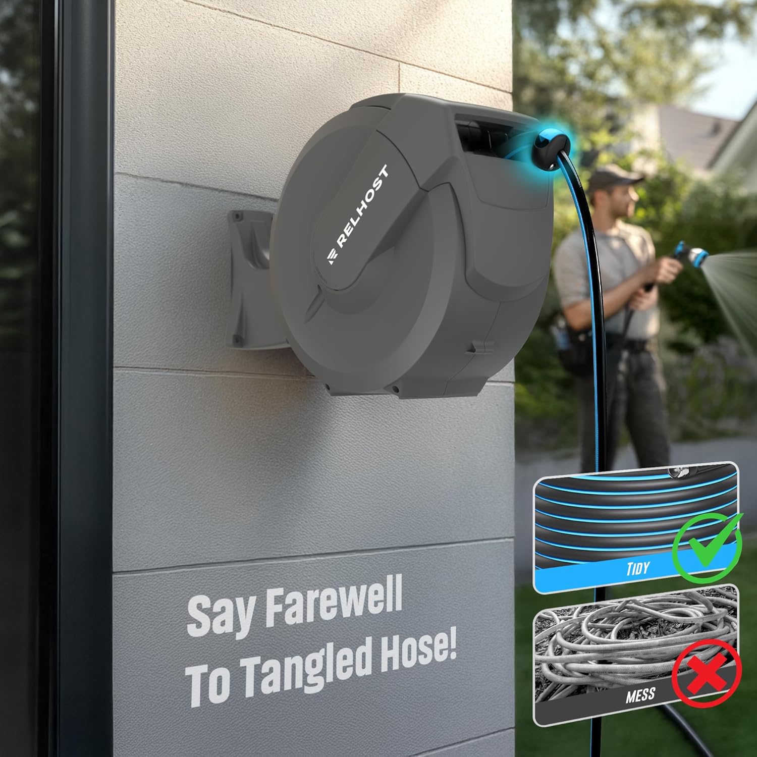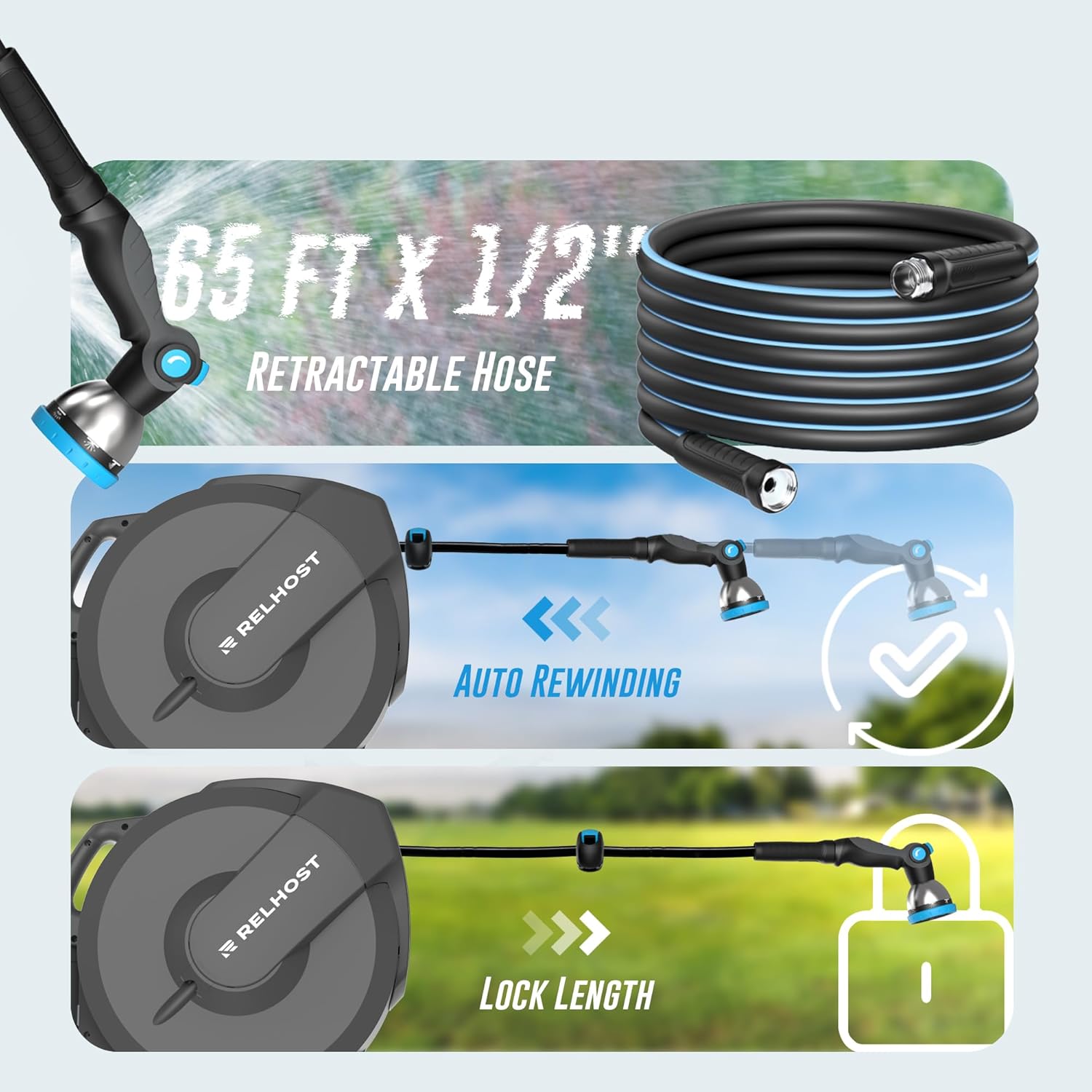 • Lock at Any Length with Ease: The Relhost retractable hose reel features a smart, free-locking system, allowing you to secure the 65 ft, 1/2-inch hose at any desired length. Enjoy seamless watering with complete garden coverage and zero slack