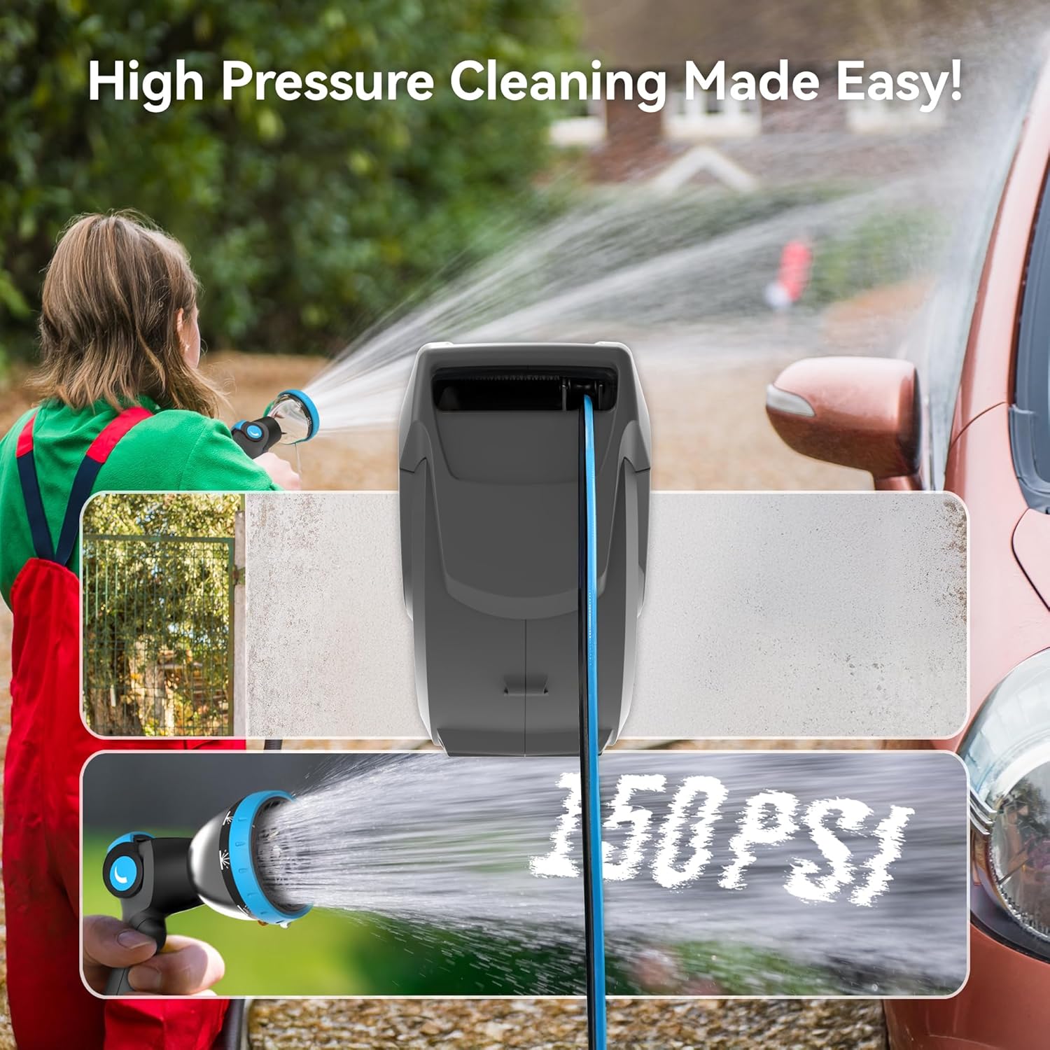 • 10 Nozzle Modes for Any Task: Our garden hose reel comes with a 10-pattern water hose nozzle—including shower, mist, jet, cone, and more—perfect for watering plants, washing cars, cleaning decks, or bathing pets