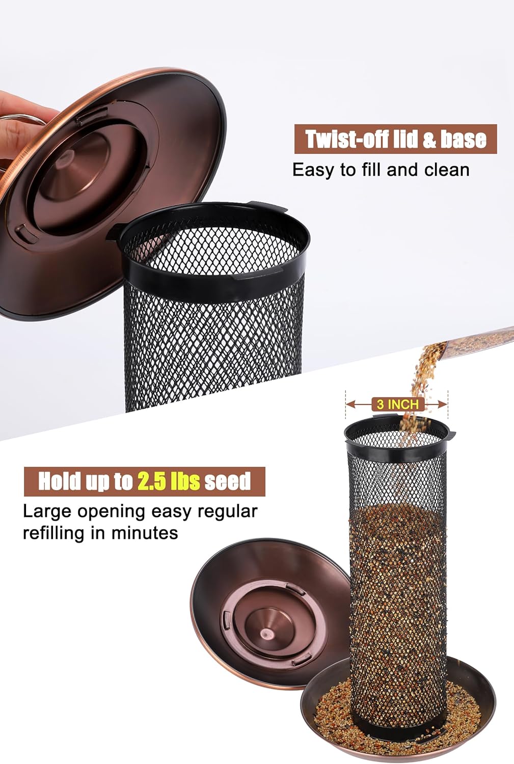 • LARGE CAPACITY: This copper tube bird feeder can hold up to 2.5 lbs of seed (suitable for thistle/finch blend seeds). No Need to Refill Frequently. Large opening, easy regular refilling in minutes and no waste when refilling