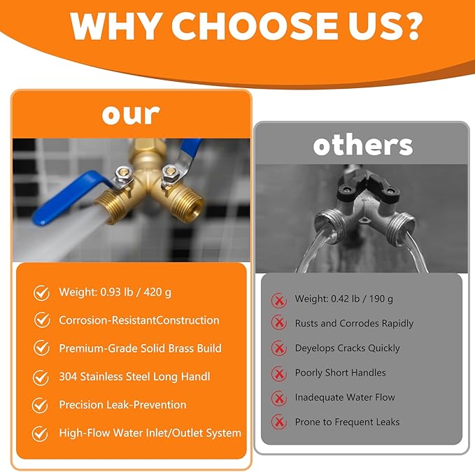 • Precision Craftsmanship And Zero-Leakage Guarantee:Precision-machined 3/4-inch standard threads and rubber seals ensure a perfect fit between garden hoses and outdoor faucet splitters. Each hose splitter undergoes hydrostatic pressure testing before shipping to achieve zero leakage at the splitter connections.