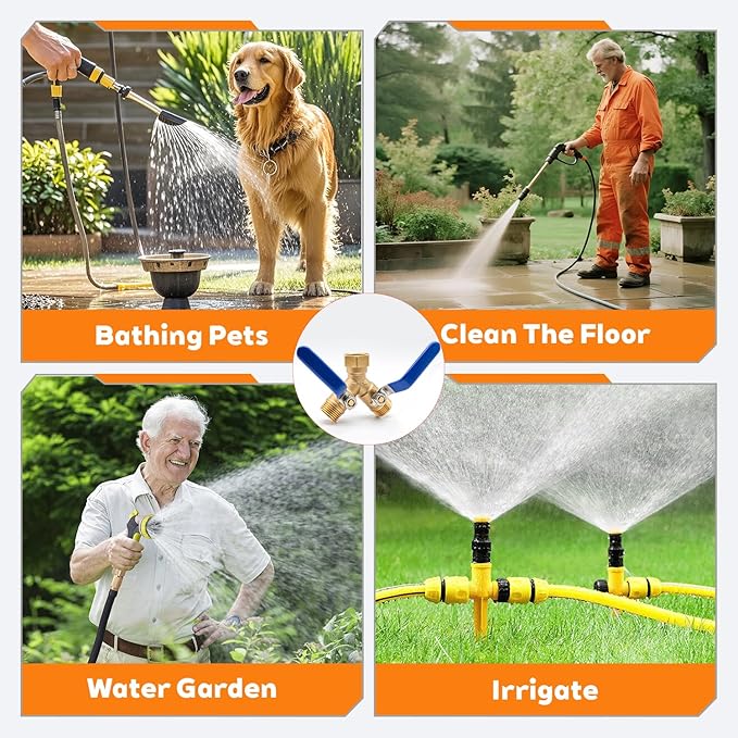 • Wide Applications: The faucet splitter can connect multiple hoses simultaneously for efficient water supply, making it ideal for spraying, cleaning, or watering. The 2-way hose splitter allows for watering plants in the yard while being applied to irrigation systems, such as spray, sprinkler, and drip irrigation setups.