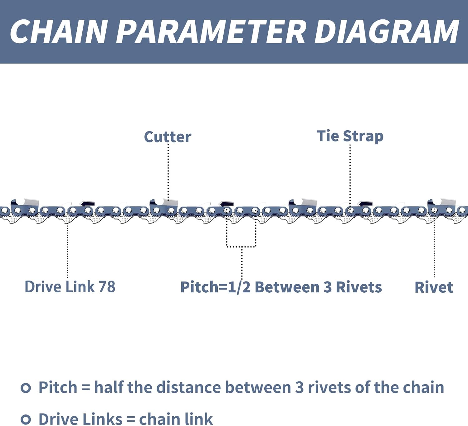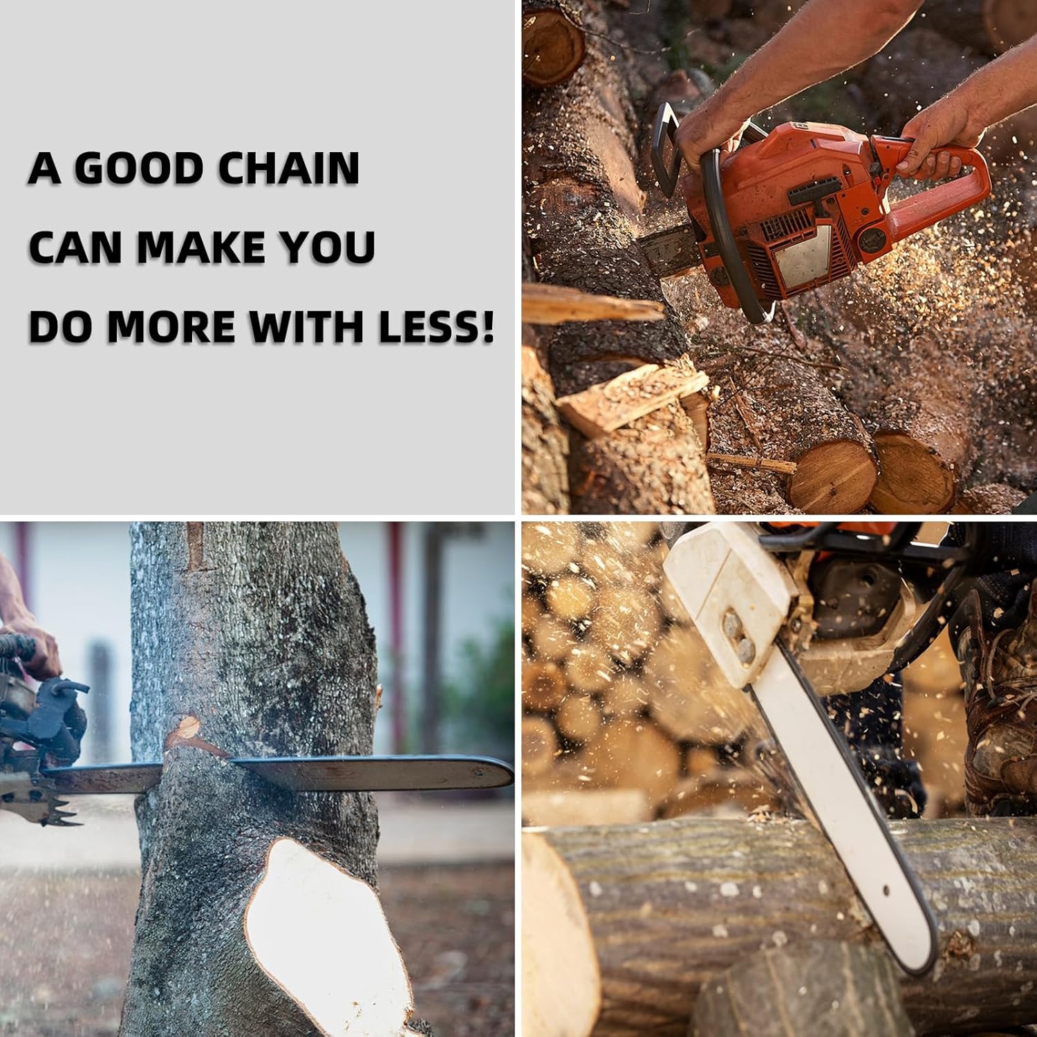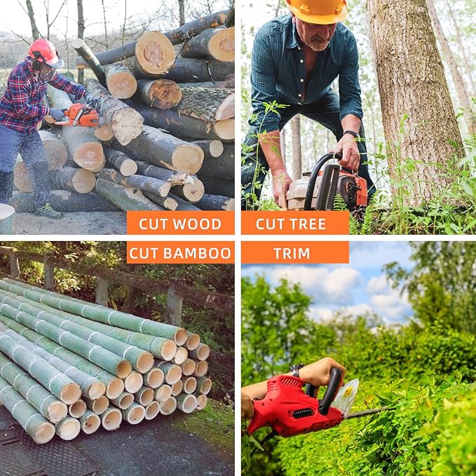 • CHAIN FEATURES: Sharp Cutters, Cuts smoothly, efficient and faster. Premium German steel with better toughness, flatness. All saw chain rivets hardened and quenched, resists wear and improves strength, not easy to break, durable and practical. Japanese Chrome-Plated Technology, with Oil Storage Grooves Resists Corrosion.
