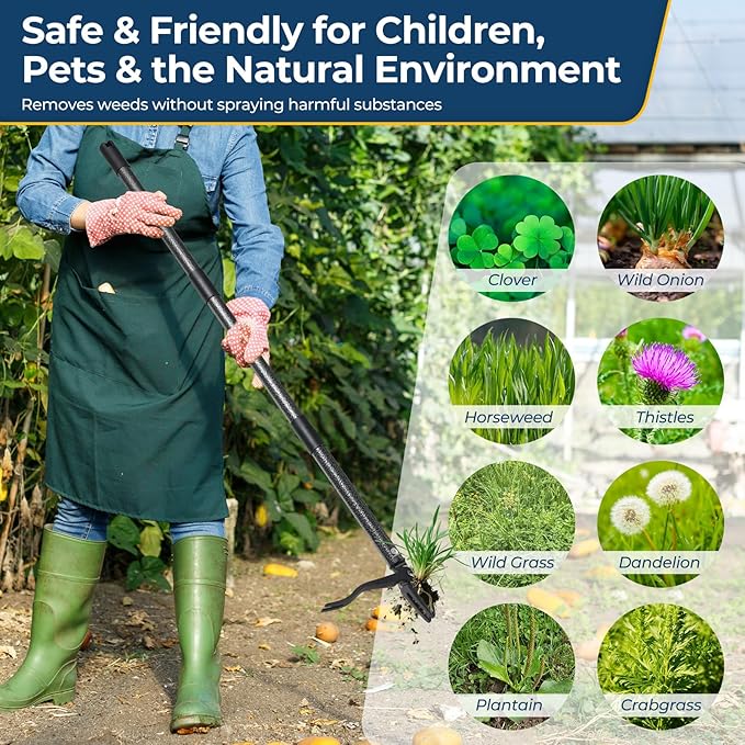 • ✅ Easy to use: Simply aim the tool at the weed, step on it, and tilt it to activate the claws. The foot lever acts as a fulcrum, amplifying the force applied to help you easily pull out stubborn weeds and their entire root system without manual digging and with less physical exertion, restoring your garden to cleanliness in seconds!