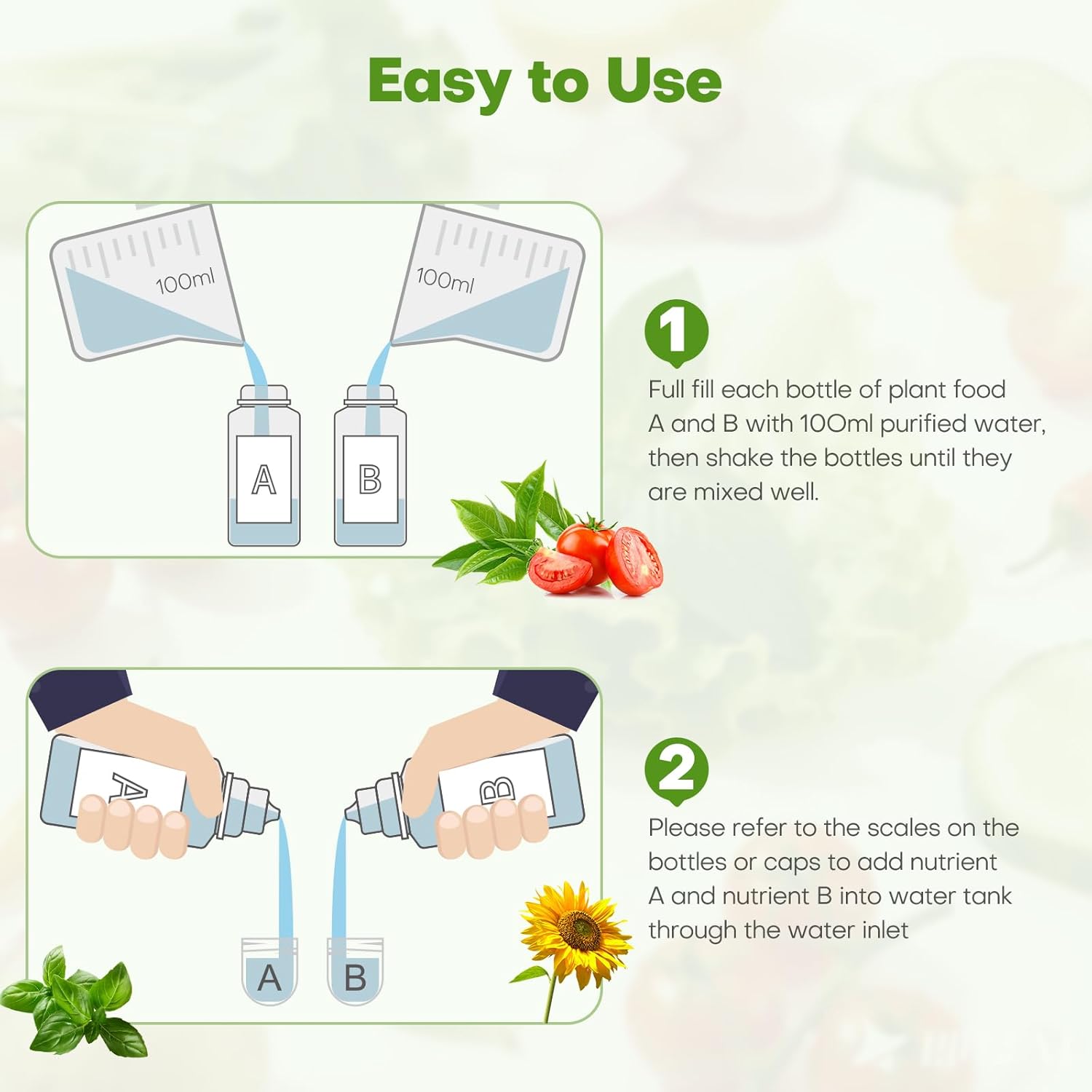 • Incredibly Easy to Use for Beginners: Achieve success from day one—even if you're new to hydroponics. Our crystal-clear instructions make it effortless: just add 5ml each of Solution A & B to 1L of water, then mix. This simple 1:200 ratio provides optimally balanced hydroponic plant food for thriving plants.