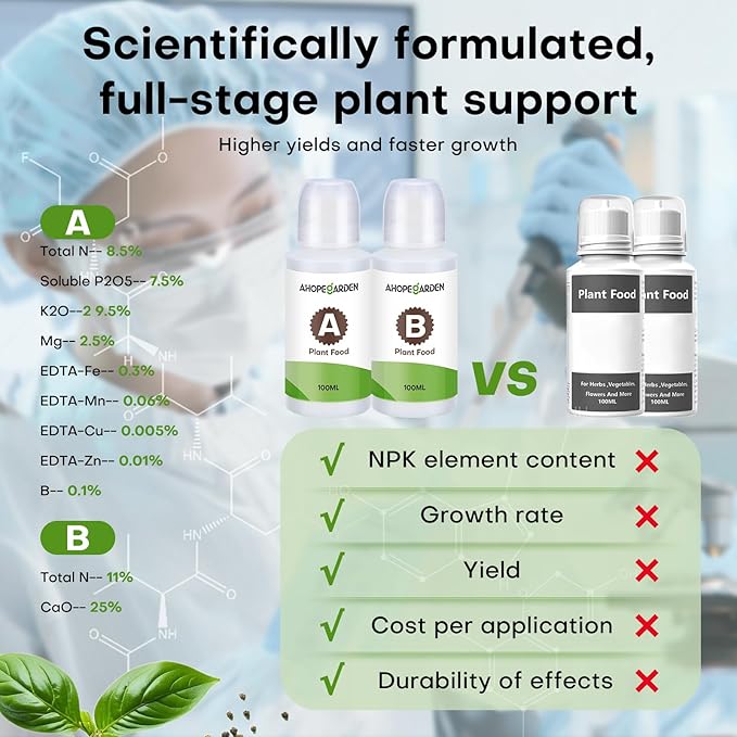 • A&B Nutrients Plant food:Clean, Complete, No Precipitation. Two bottles + six refill total 800ml, Indoor Grow Kit deliver a perfectly balanced N-P-K formula with added amino acids and humic substances. 100 % water-soluble, residue-free, and effective through every growth stage—seedling to harvest. Ideal for both hobby and professional hydroponics.