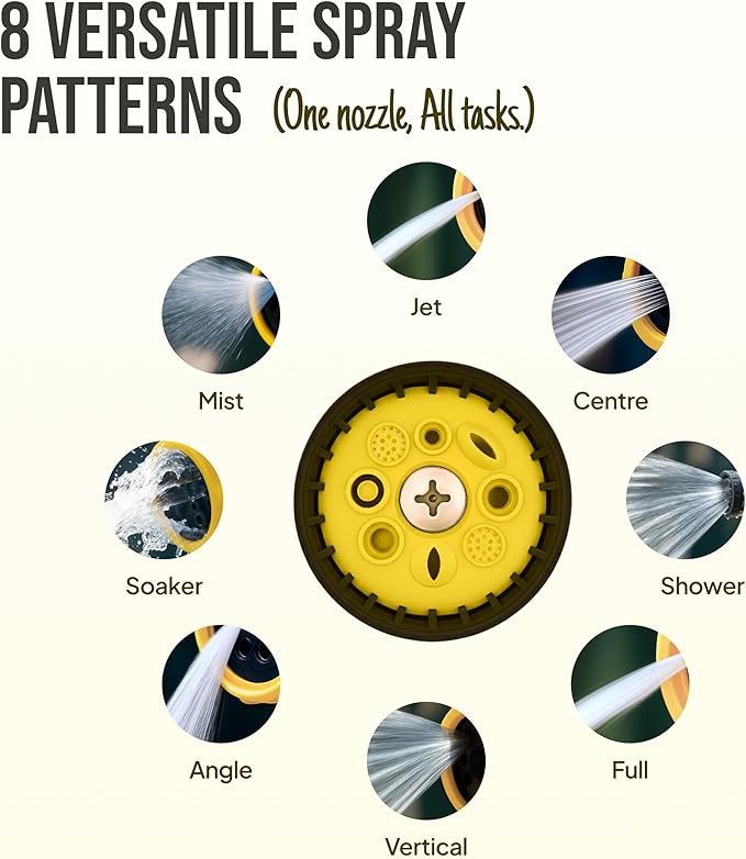 • 8 PRECISION SPRAY PATTERNS – Easily switch between mist, shower, jet, cone, and more. Perfect for gardening, car washing, pet cleaning, and patio rinsing.