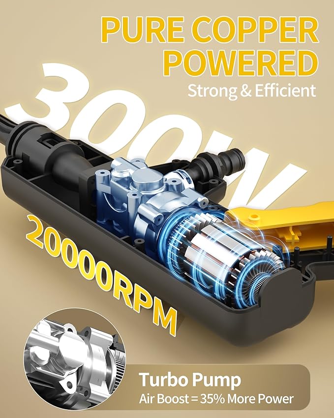 - [Multi-Function 6-in-1 Nozzle + Foam Sprayer] Switch effortlessly between spray patterns—0°, 15°, 25°, 40°, jet stream, and shower—the cordless high pressure washer gun is great for powerwash home, cars, bikes, patios, windows, and more. The included foam pot of the portable power washer cordless makes deep cleaning simple and effective. The versatile battery pressure washer cordless is your great buddy in different cleaning tasks, wonderful as powerwashers for home & car power washer.