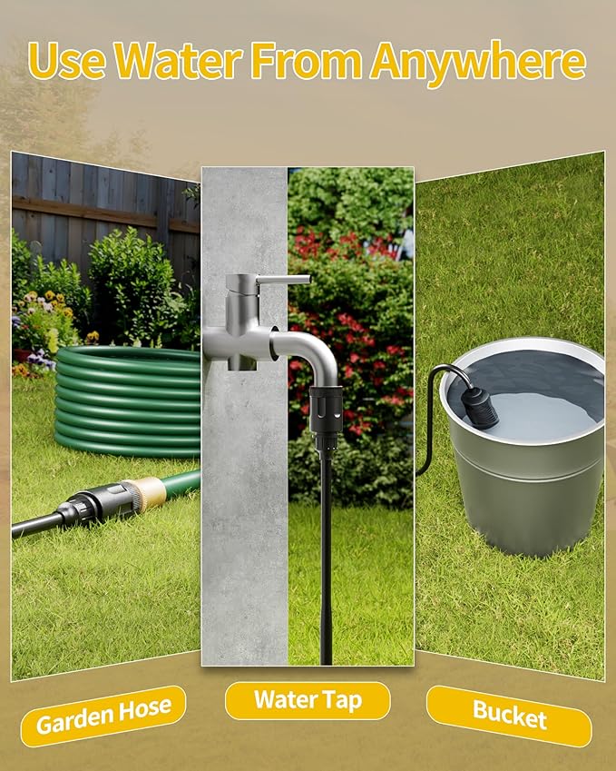 - [Flexible Water Source Options] Whether from a faucet, bucket, pool or even garden hose, this portable power washer has the right connectors for the job. The weighted filter head ensures smooth water intake from open sources, while the multiple tap/garden hose adapters of our handheld power washer designed for fitting all available standards water taps and garden hoses in the market offers added great convenience.
