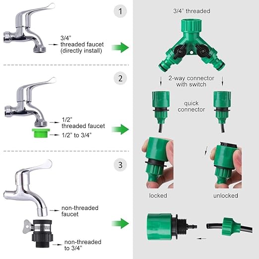 • Multi-type Faucet Connectors: The 2-way connector can divide the drip irrigation kit up to multiple tributaries, increase the water pressure of the irrigation kit, make each nozzle works as you need. The 1-way universal/quick/threaded faucet connector fits many types of faucets, no worry of using it.