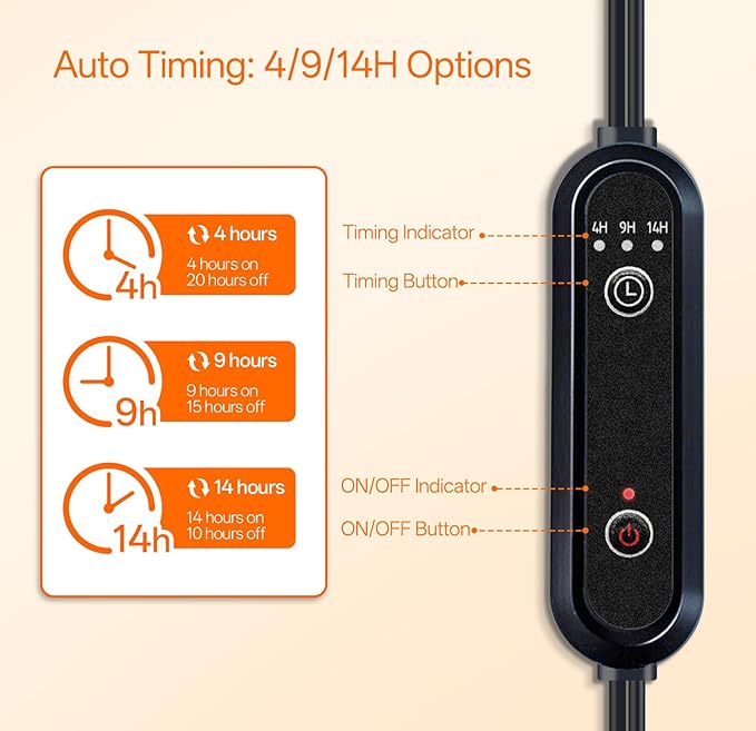 • Smart Auto Timer with 4/9/14H Cycles - Say goodbye to manual switching! This grow light stand features an intelligent timer that automatically cycles through 4, 9, or 14-hour lighting schedules. This hassle-free function ensures your plants get consistent, optimal light without you needing to remember to turn it on/off