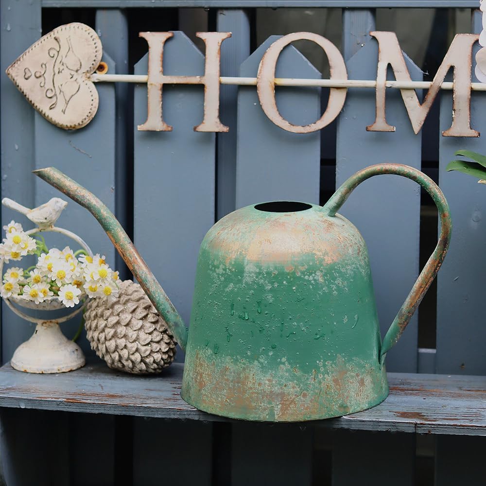 • VINTAGE DESIGN: Rustic metal watering can with distressed green patina finish and decorative bird accent, perfect for garden-themed home decor