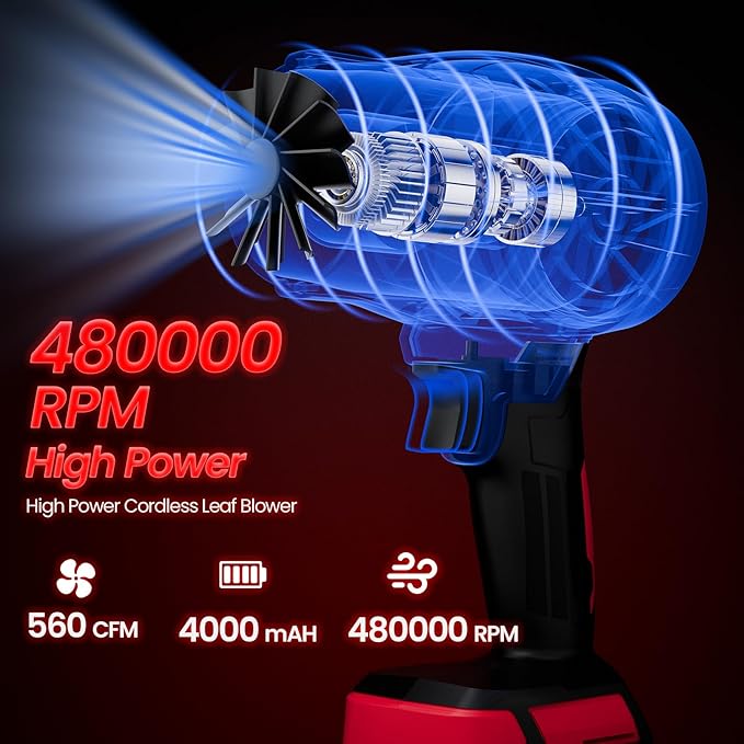 • 【powerful】--Turbo Wind:Our leaf blower cordless upgraded motor, has more horsepower than traditional motors.Electric leaf blowermax air volume【560 CFM 】and max air speed --160 MPH--480000PRM. Leaf blower is efficient cleaning, no need for rakes and traditional cleaning tools, blowing down leaves and keeping the garden clean.