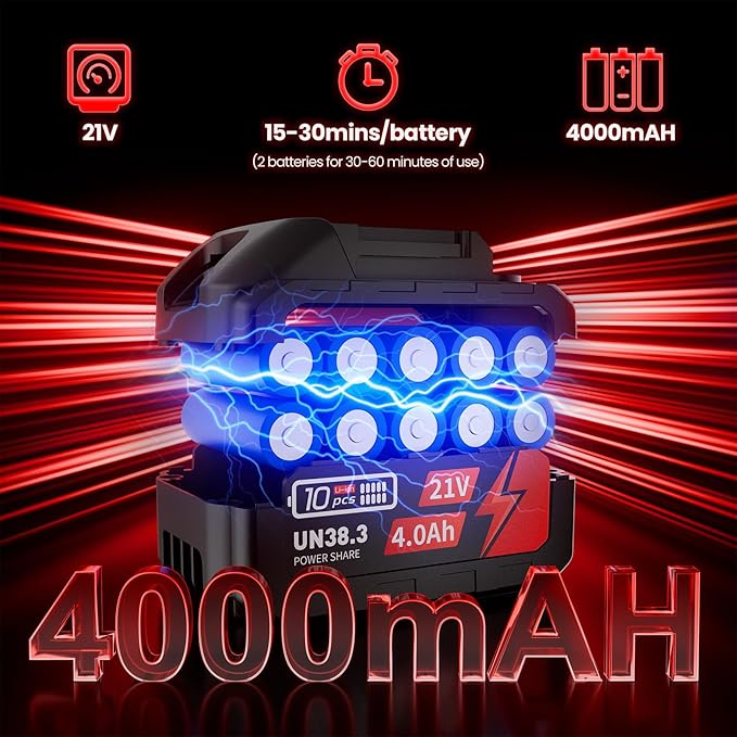 • 【Long-lasting】-- 2 Batteries Runtime:The leaf blower cordless with battery and charger comes with--2pc X 21v 4.0Ah batteries--Electric leaf blower can work continuously up for 25-45 minutes, improve the efficiency of your backyard cleaning.