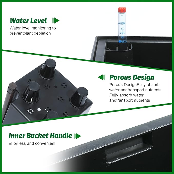 • Automic Watering System: Each tall black planters comes with built-in drainage holes and a sink to ensure that your greenery absorbs water smoothly and minimizes root rot. When the water level is low, the automatic watering system kicks in to provide your plants with the necessary moisture with minimal effort