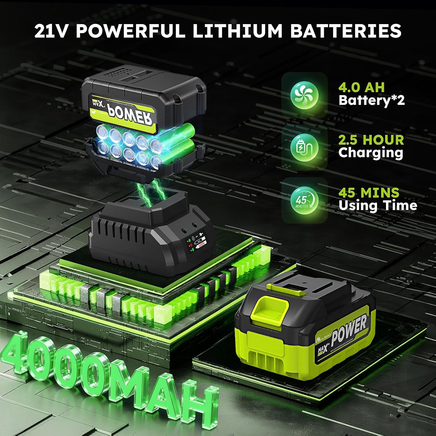- 【Two 4000mah Batteries & Fast Charger】This cordless leaf blower is equipped with two 4000mAh lithium batteries and a fast charger, providing long-lasting and stable power support. The power indicator light shows the remaining battery life and charging progress in real time, making it easier for users to monitor usage. Additionally, the fast charger can fully charge the batteries in just 2 hours, significantly improving work efficiency.