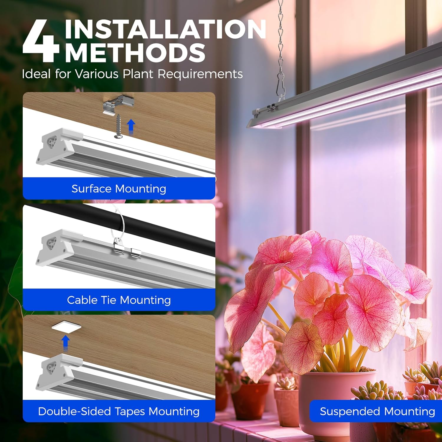 • Efficient Heat Dissipation & Wide Application: Our 4ft plant light utilize an aluminum housing, ensuring optimal heat dissipation and prolonging LED life. These lights are ideal for plant grow tents, shelves, seedling starters, hydroponic setups, kitchens, and windowsills, help your plants flourish in any environment