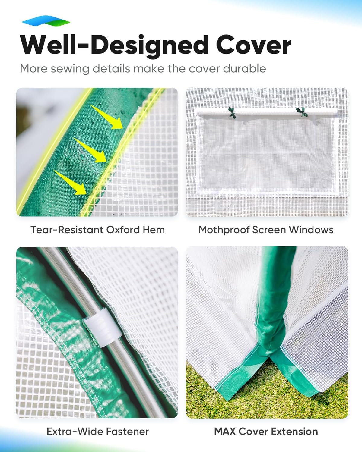 • 【Fully Sealed Windows and Doors】 - With all-sided velcro on the windows, the greenhouse can be heat-locked and keep a relatively higher temperature in winter than the outside. Meanwhile, the velcro and cover buckles on the doors can make it airtight. Ventilation can also be achieved by flexible screen windows when needed.
