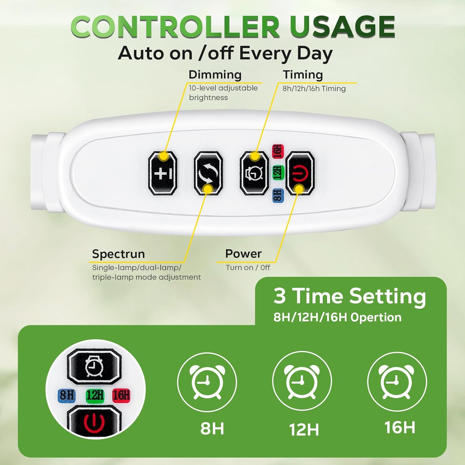 • Auto On/Off Timer: With automatic cycle memory timing function, the grow light automatically turns on/off every day after setting, 8/12/16 lighting time modes to choose from. The plant light will turn it on by itself everyday as your setting, you will no longer have to worry about your plants when you are not at home.