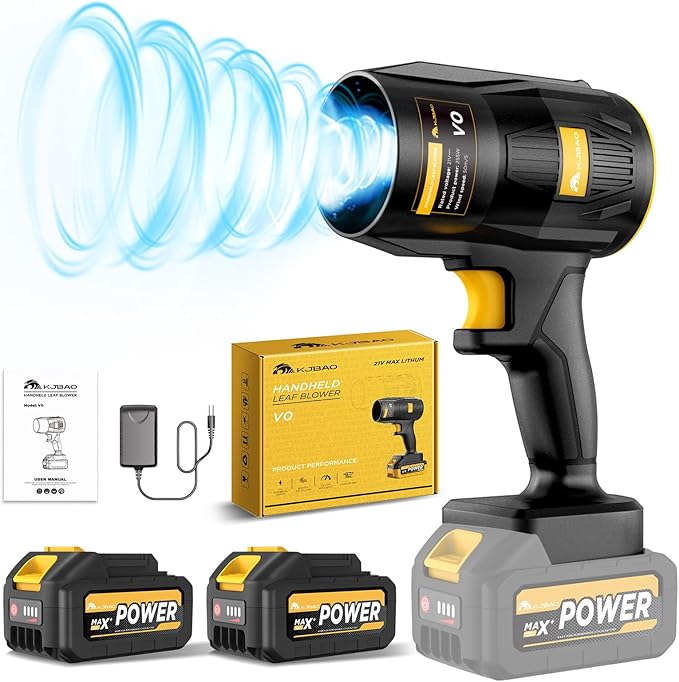 - 【Powerful & Efficient Cleaning】The 21V KJBAO cordless handheld leaf blower is the perfect solution for fast, efficient outdoor cleanup. Featuring a powerful motor, it delivers wind speeds up to 200MPH and a remarkable 800CFM airflow, with a high speed of 300,000 RPM. This provides you with the strength and speed needed to tackle a variety of outdoor tasks, from clearing leaves to removing debris and dust.