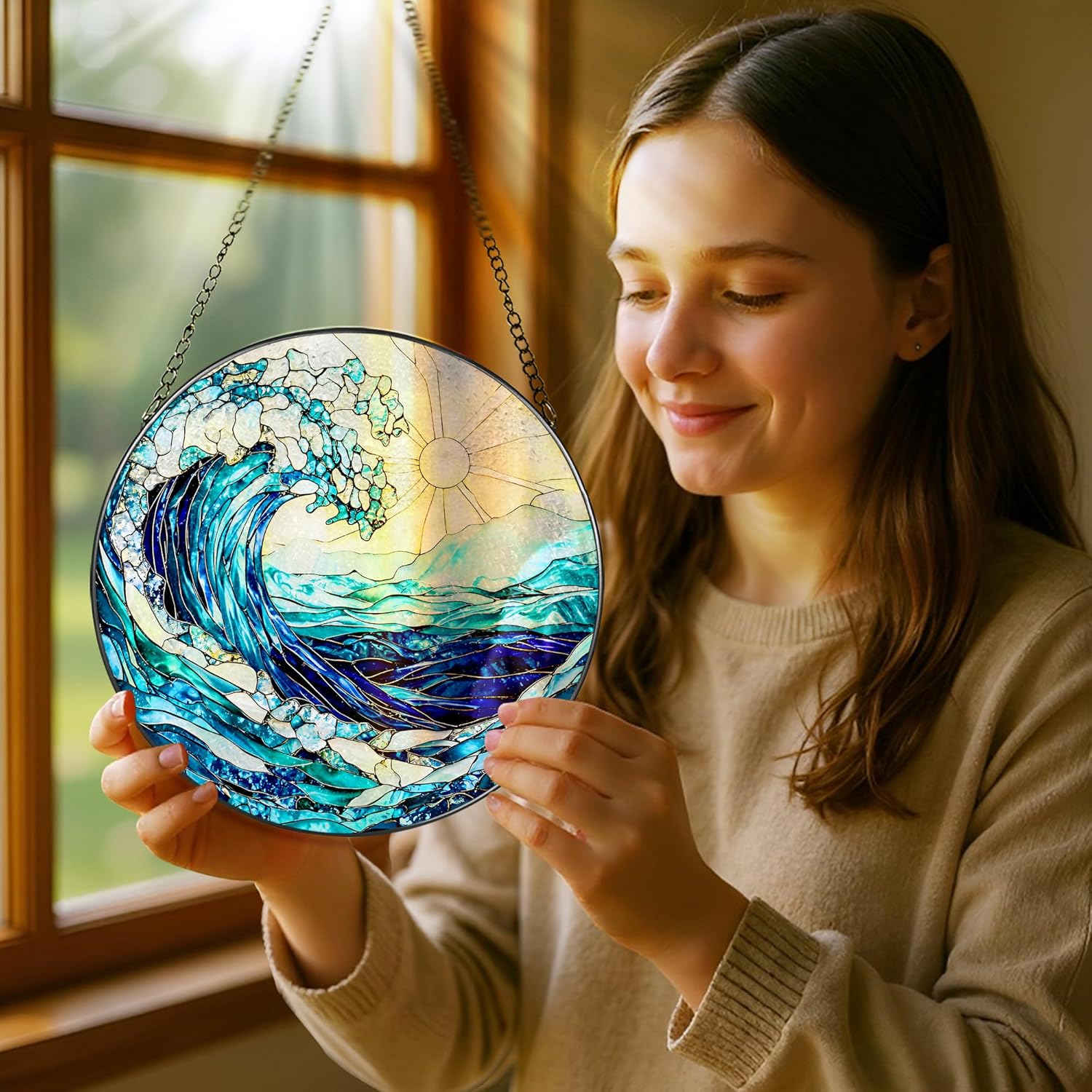 Stained Glass Window Hanging, 8 Inch Ocean Waves Stained Glass Suncatcher, Window Hanging Decor, Beach Decor, Ocean Suncatcher Gift, Beach Lover Gift, Gifts for Couples Friends Family