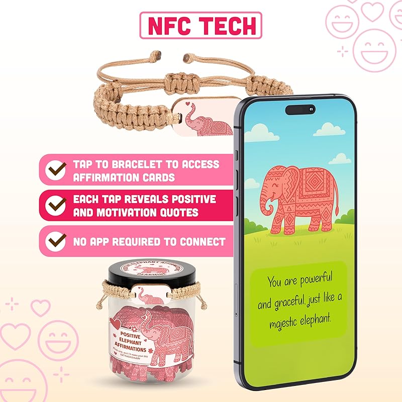 • ๐Ÿ“ฒCute Elephant Design + NFC Feature โ€“ Positive elephant jar with playful elephant themed gifts style, including an NFC bracelet that unlocks extra digital encouragement, blending elephant decor gifts charm with trendy appreciation gifts.
