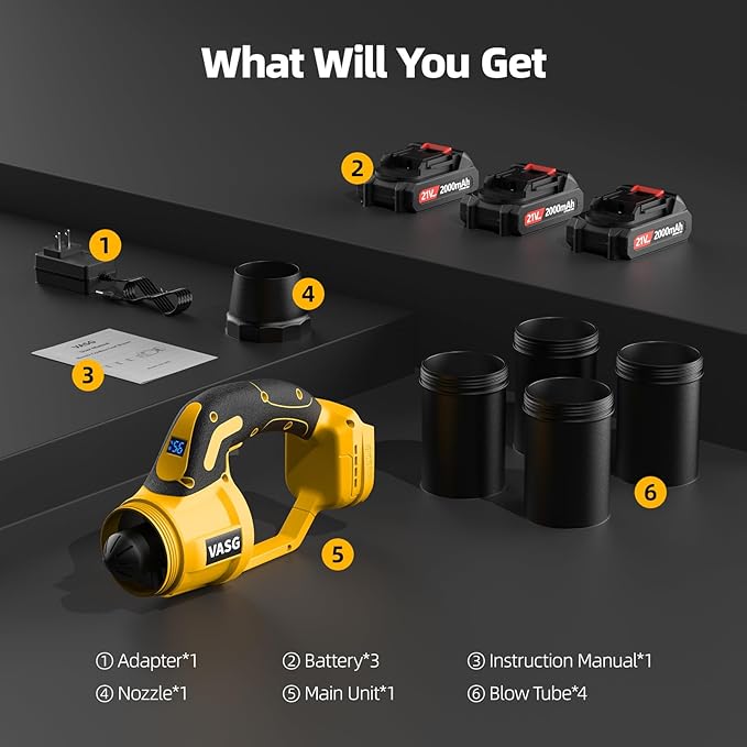 • Included Components : 1*Instruction Manual, 1*Leaf Blower, 3*Battery, 1*Charger, 4*Blow Tube, 1*Nozzle