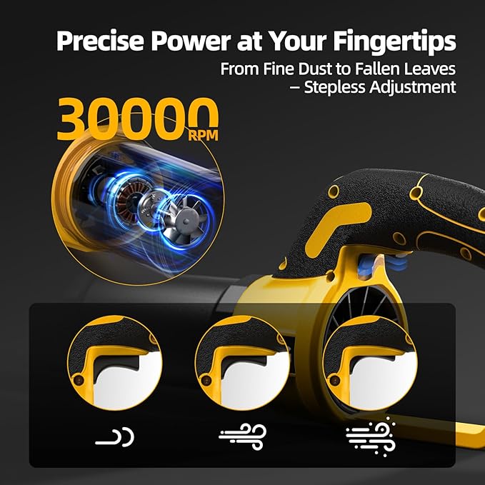 • Durable Build & High-Performance Motor: Built for long-term outdoor use, this battery-powered leaf blower delivers consistent airflow with a high-performance motor reaching up to 30,000 RPM, ensuring reliable and powerful performance for all your yard and garden tasks