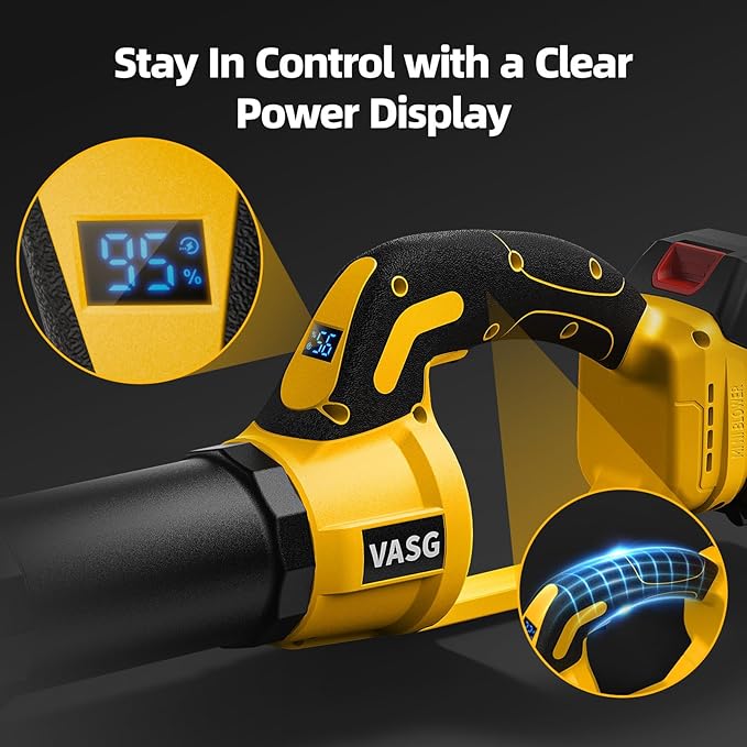• Stepless Speed Control & Power Display: Customize your blowing power from gentle to turbo with the stepless speed adjustment on this leaf blower. The built-in digital screen displays real-time battery percentage, allowing you to monitor power usage during yard cleanup or lawn care tasks