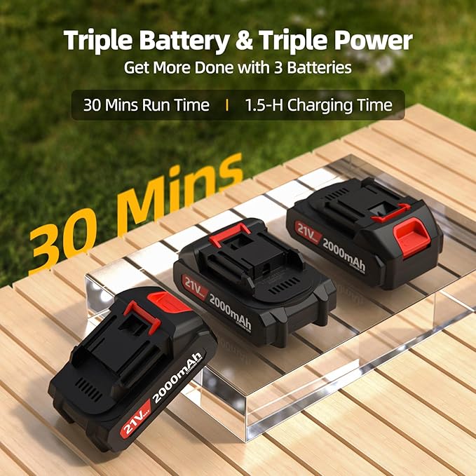 • 3× Battery Design for Longer Use: With three 21V rechargeable batteries and a fast charger, this cordless leaf blower delivers extended runtime and nonstop power. Quickly swap batteries for continuous yard and garden cleanup, while smart temperature protection ensures safe charging and longer battery life