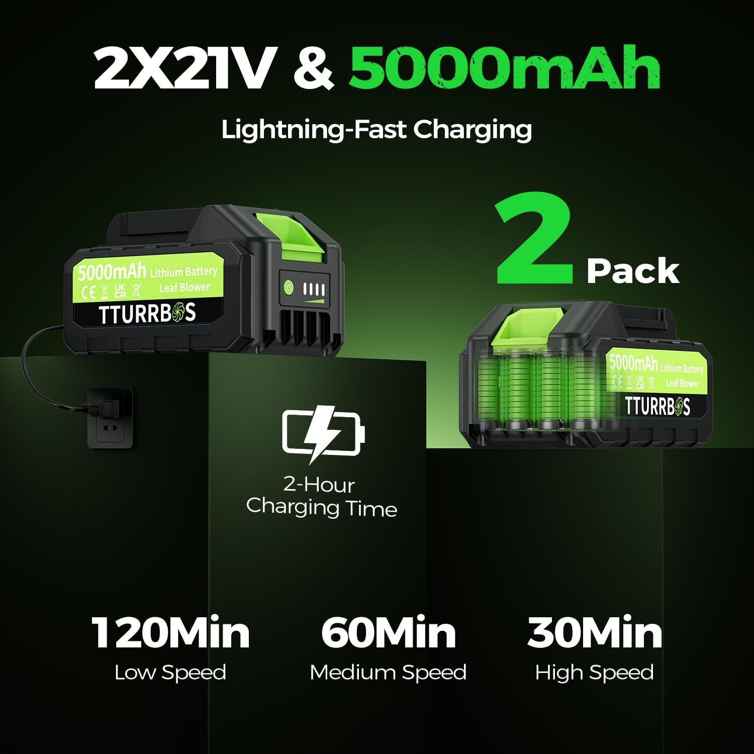 - 🌀【Long-Lasting Power & Fast Charging】Our cordless leaf blower with battery and charger delivers extended runtime and turbo performance. With dual 5.0Ah 21V lithium batteries, it runs for 120 minutes at low speed (30 minutes high speed) and features a 4-stage battery indicator (25%-50%-75%-100%) for real-time tracking. The advanced battery system ensures strong, steady airflow with no power loss, and the included fast charger fully powers your leaf blower in just 2 hours