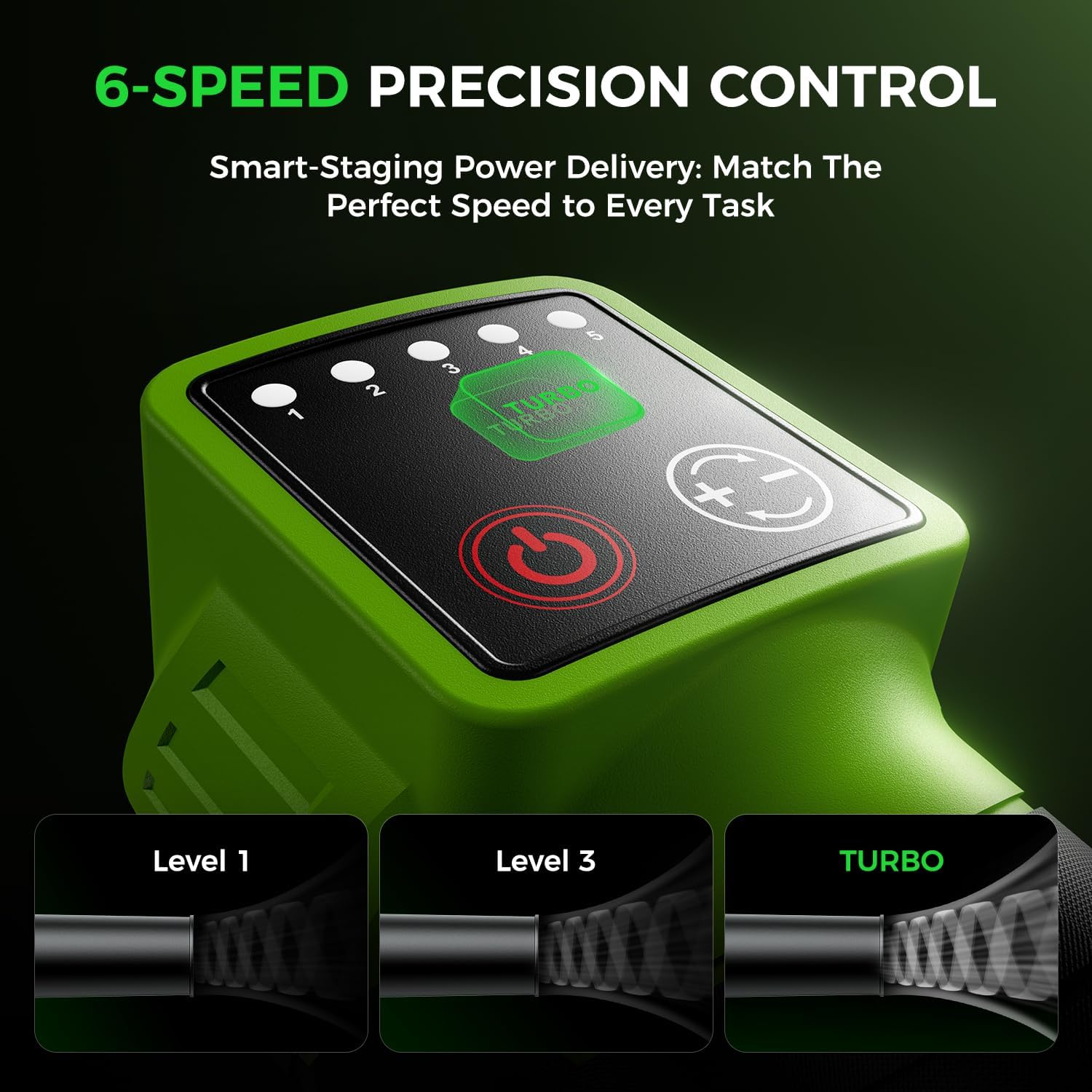- 🌀【6-Speed Power Settings for Every Task】Master every yard task with our professional leaf blower cordless featuring 6 precision speeds. Five adjustable settings (80-160 MPH) easily handle everything from patio dust to wet leaves, while Turbo mode delivers a powerful 180 MPH for tough debris. The 6-speed system maximizes battery life:lower speeds extend runtime for light work, while Turbo mode provides instant power when needed—giving you complete control over performance and efficiency