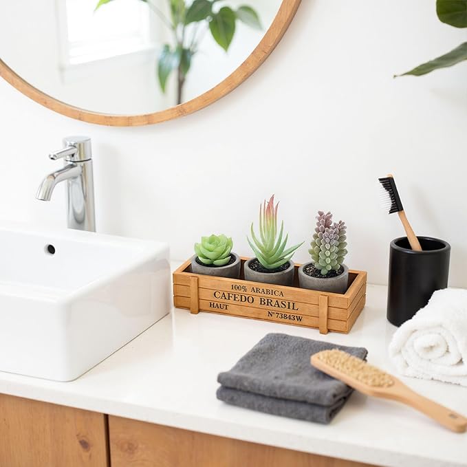 DomeStar 3PCS Small Fake Plants, Artificial Succulents Plants with Wooden Box for Home Bathroom Kitchen Office Farmhouse Decor Green