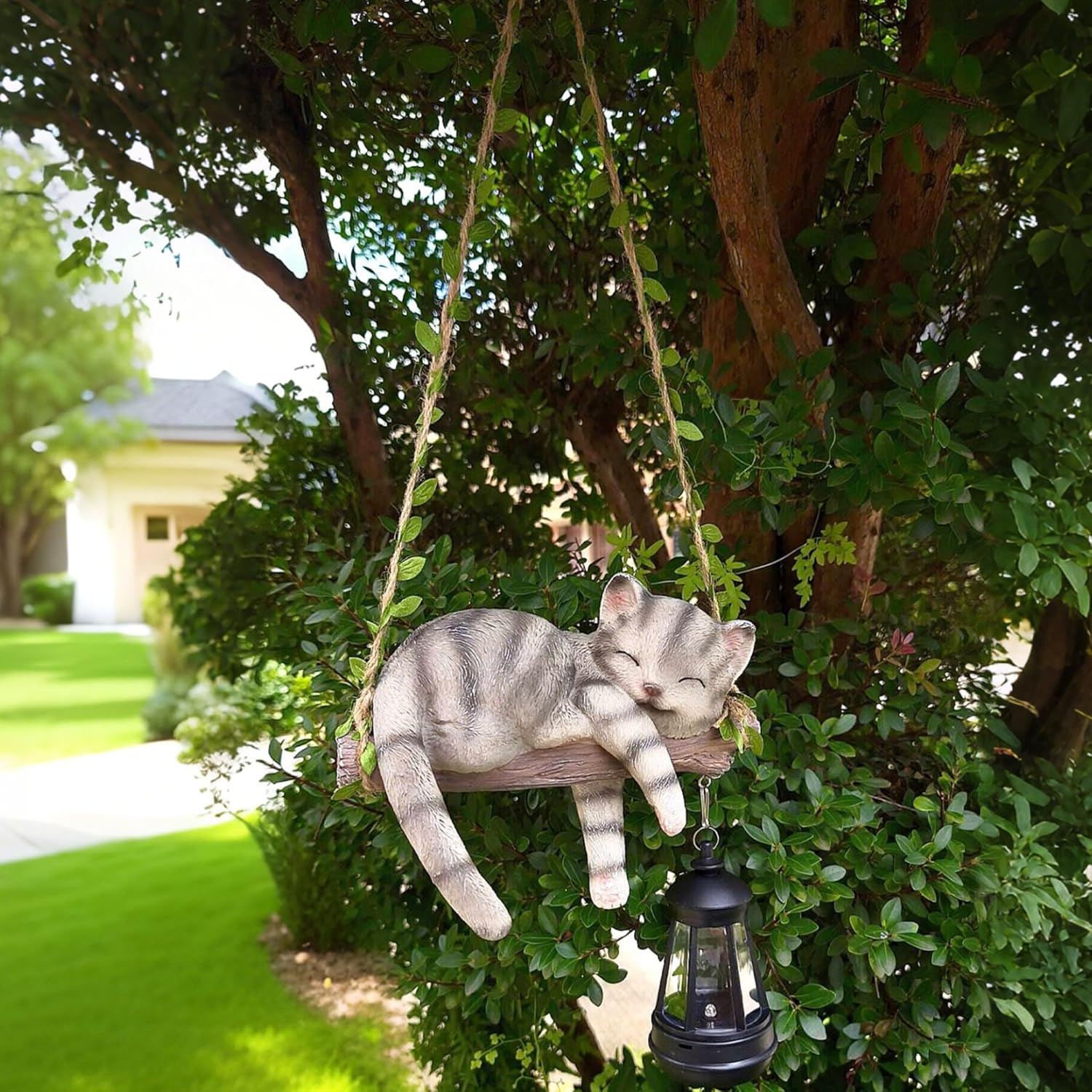 • CHARMING CAT ON SWING: Crafted from premium resin material, this exquisite figurine features an adorable cat napping peacefully on a vine-and-wood swing. Hand-painted with lifelike details and fade-resistant coatings, it retains its vibrant colors even under harsh weather conditions. With an IP44 waterproof rating, it's built to last indoors and outdoors.